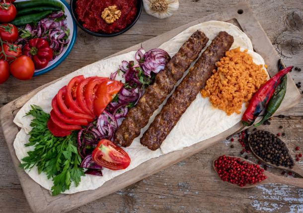 Özel baharatlarla yoğrulmuş kıyma, şişte pişirilerek hazırlanan Adana kebap; acılı lezzetiyle kebap severlerin favorisi.